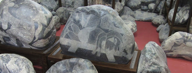 Varios Museos tienen piedras grabadas, obvio el de Doctor Javier Cabrera Darquea. En Nazca, el Museo Antonini tiene sólo una que no está asociada a las teorías de Cabrera ni a las demás piedras. Adjuntamos la fotografía. Deberá pesar unos 60 kilos, medirá unos 80 centímetros, para que os hagáis una idea de la pieza.
